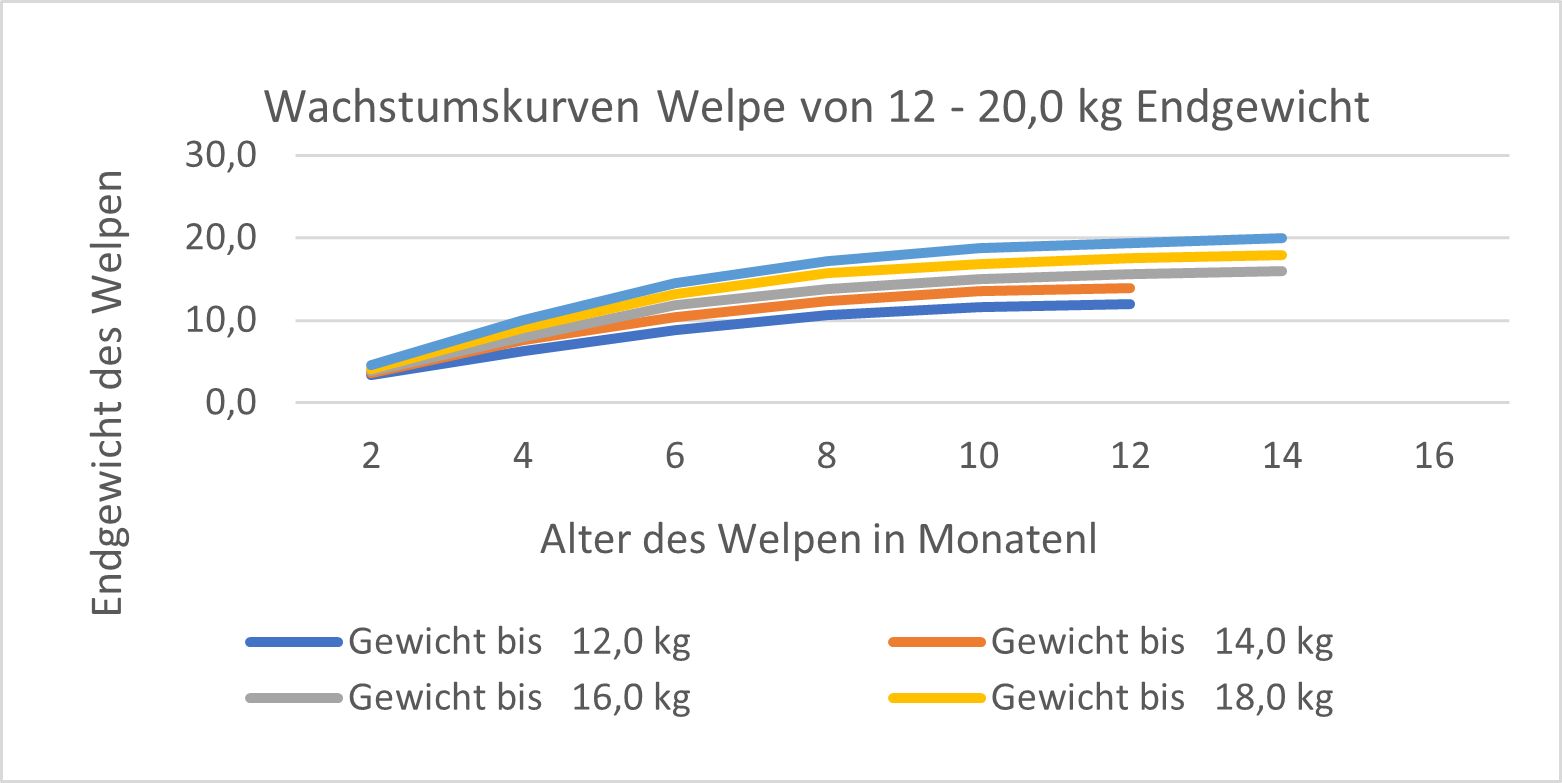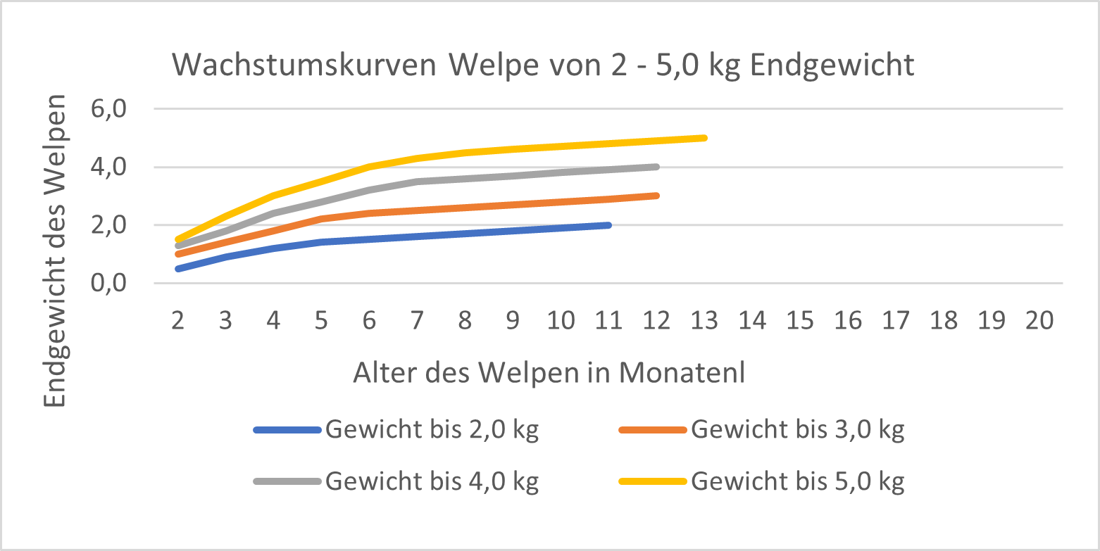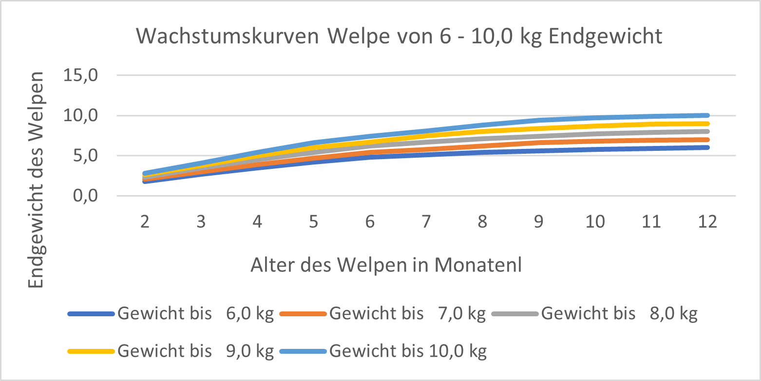 Was vielen Hundehaltern nicht zu 100 % bewusst ist, je kleiner der Hund, desto eher hat er seine Endgröße erreicht und ist ausgewachsen. Daher sind Hunde kleiner Rassen bis zum Endgewicht bis zu 10,0 kg in der Regel mit dem 6. - 7. Monat ausgewachsen und können auf Futter für erwachsene Hunde umgestellt werden. Die Größe des Hundes kann man eigentlich nicht durch die Ernährung beeinflussen, wohl aber die Wachstums-Geschwindigkeit und ACHTUNG: schnelles Wachstum ist unerwünscht (im Gegensatz zu Masttieren) bei Hunden kann das schnelle Wachstum negative Einflüsse z.B. auf die Gelenke haben.