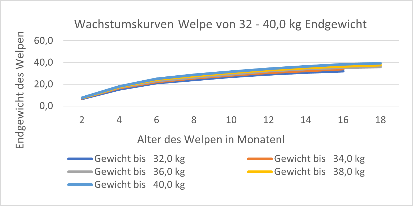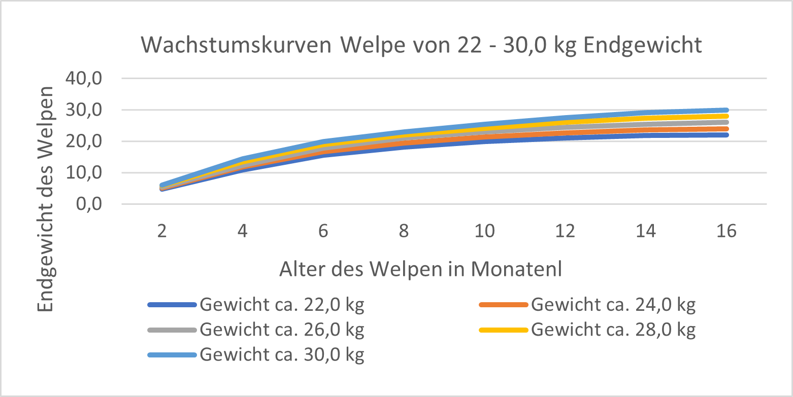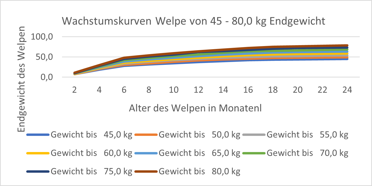 Was vielen Hundehaltern nicht zu 100 % bewusst ist, je kleiner der Hund, desto eher hat er seine Endgröße erreicht und ist ausgewachsen. Daher sind Hunde kleiner Rassen bis zum Endgewicht bis zu 10,0 kg in der Regel mit dem 6. - 7. Monat ausgewachsen und können auf Futter für erwachsene Hunde umgestellt werden. Die Größe des Hundes kann man eigentlich nicht durch die Ernährung beeinflussen, wohl aber die Wachstums-Geschwindigkeit und ACHTUNG: schnelles Wachstum ist unerwünscht (im Gegensatz zu Masttieren) bei Hunden kann das schnelle Wachstum negative Einflüsse z.B. auf die Gelenke haben.
